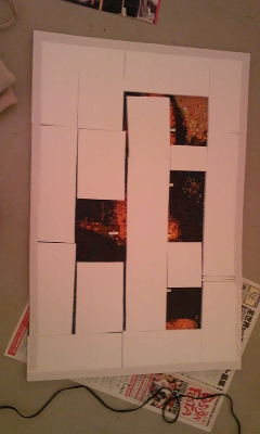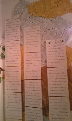 英字新聞風の包装紙3色(茶色、しろ、黄色)をテキトーに破って一度ぐちゃぐちゃにして伸ばして貼った上に説明書きを画鋲で止めました。